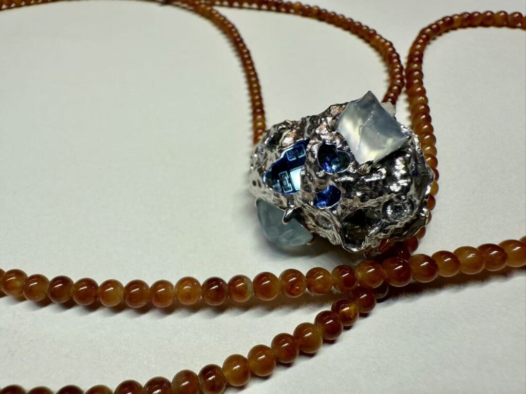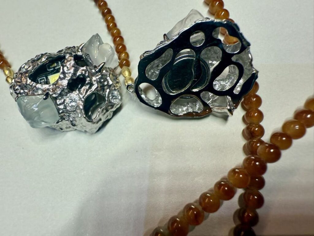 Embrace Circuit is a transformable wearable light sculpture. Meteorite-textured 18K white-gold forms cradle Burmese jadeite and diamonds, and are strung with Burmese red-jade beads, tracing the orbit of Saturn’s ring. At the instant of magnetic contact, the circuit closes and a gentle light appears—the fractured meteor becomes whole. The work translates intimacy into energy—“embrace = charge”—saluting the entwined bodies in Egon Schiele’s paintings while placing love and hope on the same cosmic orbit as the wearer.